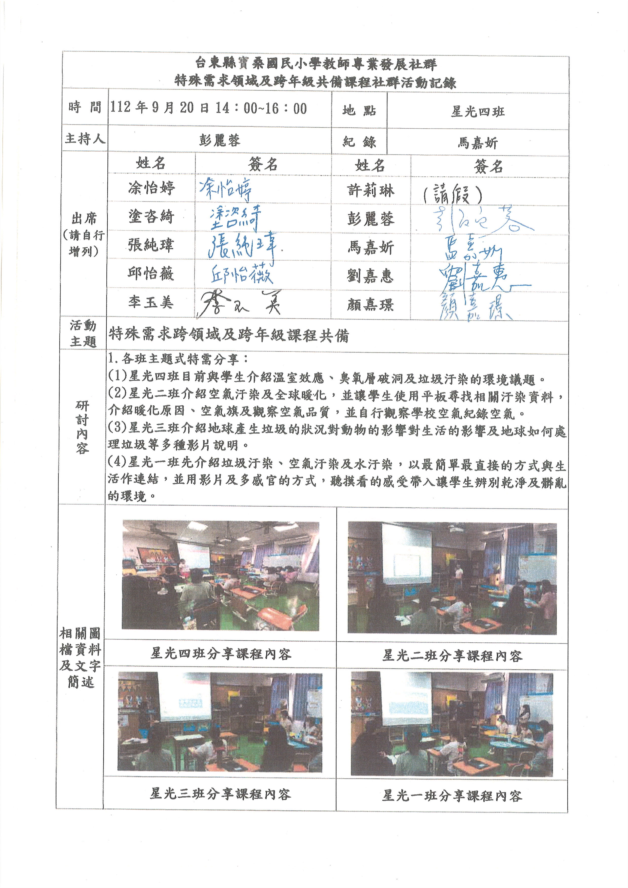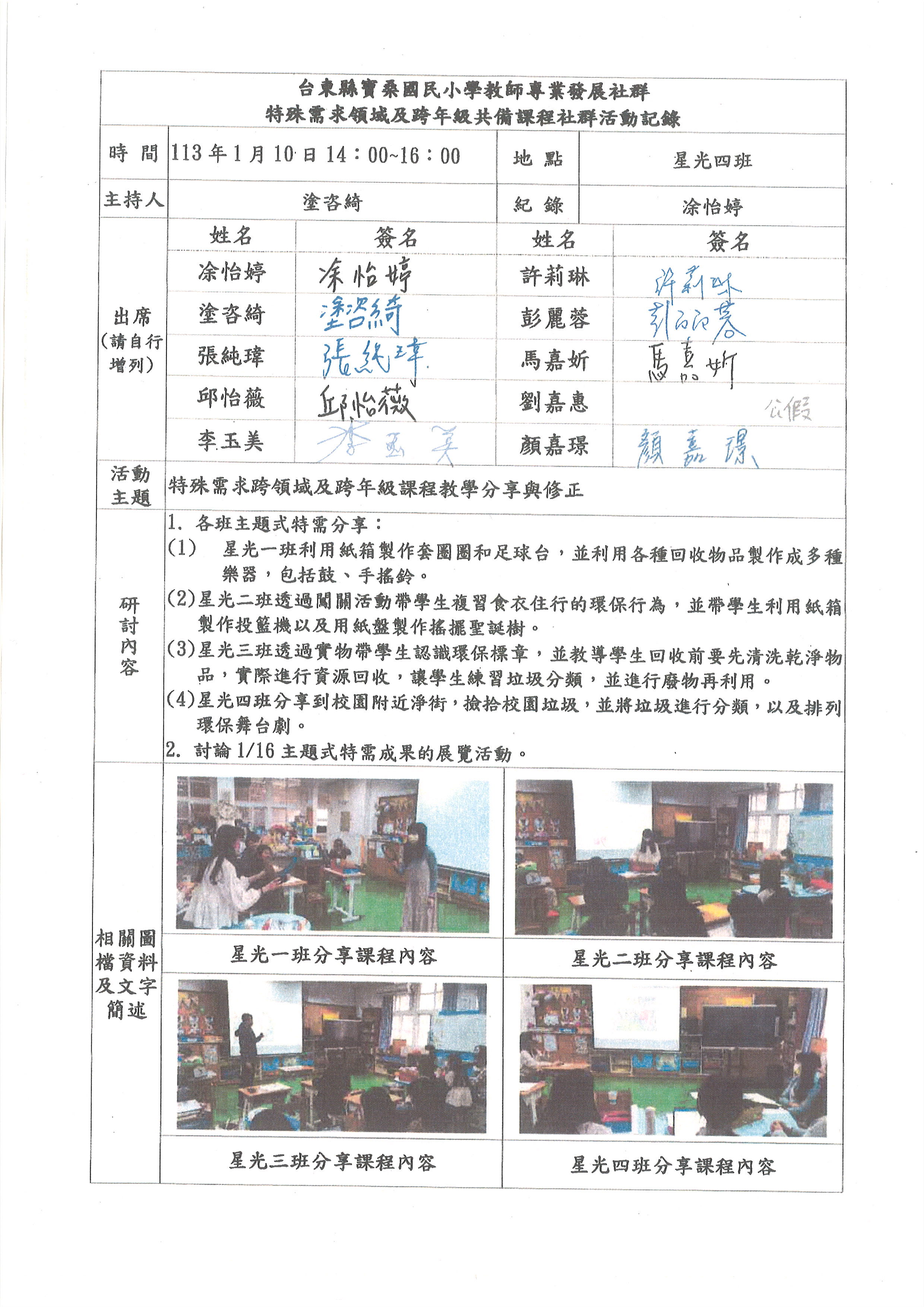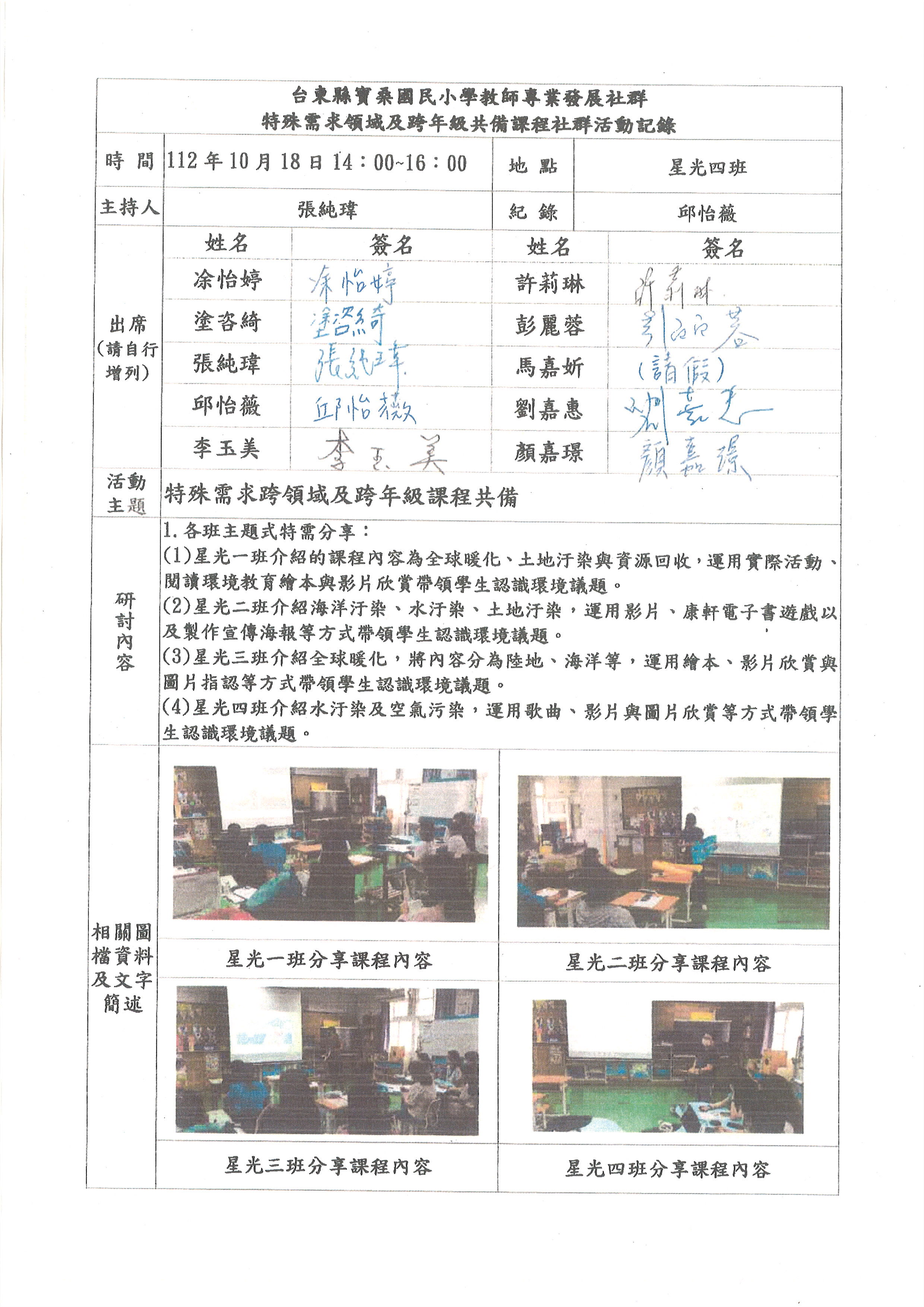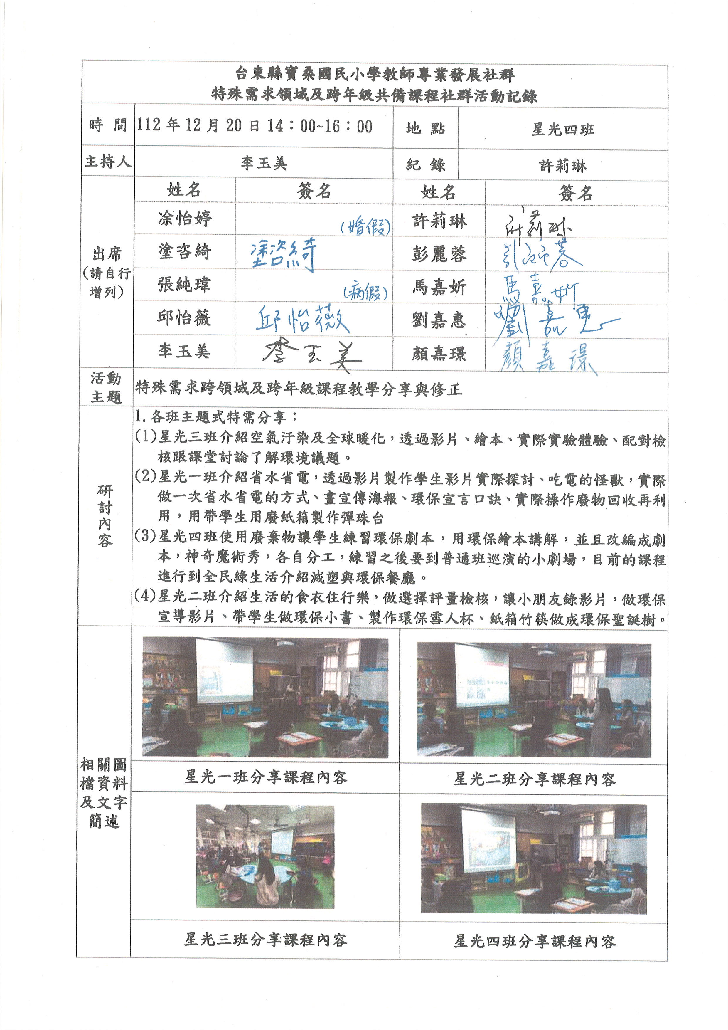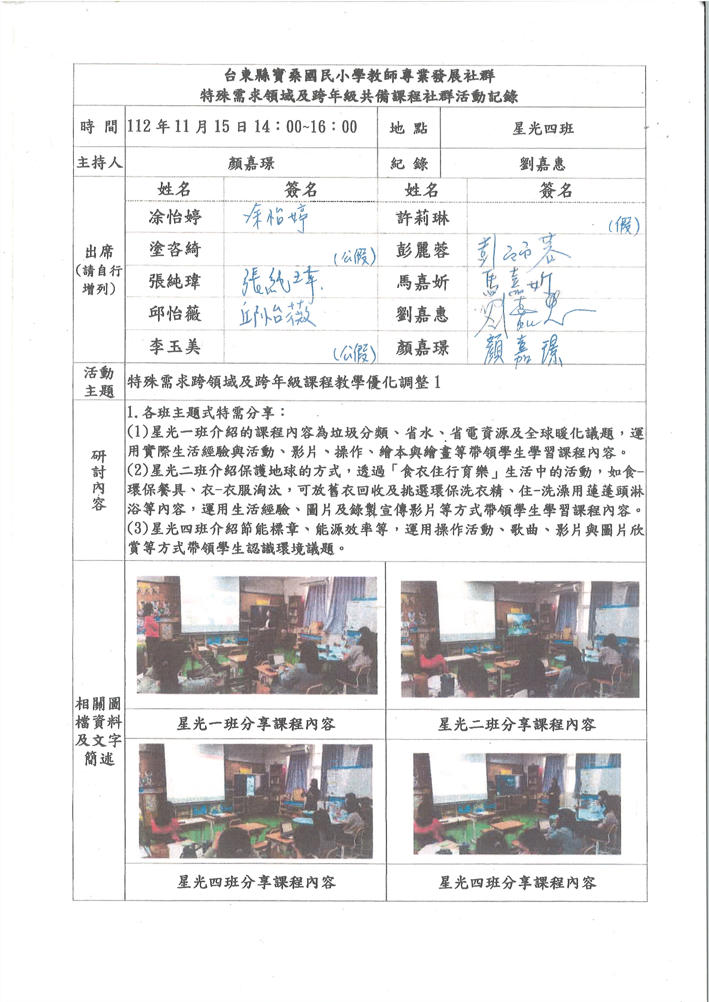 112.9.20 特殊需求跨領域及跨年級課程共備 112.10.18 特殊需求跨領域及跨年級課程共備 112.11.12 特殊需求跨領域及跨年級課程教學優化調整 112.12.20 特殊需求跨領域及跨年級課程教學分享與修正 113.1.10 特殊需求跨領域及跨年級課程教學分享與修正 113.3.6 特殊需求跨領域及跨年級課程共備 113.3.20 特殊需求跨領域及跨年級課程共備 113.4.17 特殊需求跨領域及跨年級課程教學優化調整 113.5.22 特殊需求跨領域及跨年級課程教學分享與修正 113.6.12 特殊需求跨領域及跨年級課程教學分享與修正